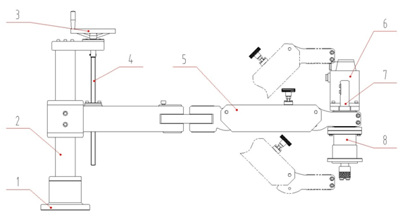 技術(shù)參數(shù): 攻絲能力: M24-M60工作半徑: 1200mm 上下行程: 360mm 1固定底盤(pán) 2 支撐立柱 3 升降手輪 4 升降絲杠 5 機(jī)架 6 伺服電機(jī) 7 操作手柄 8 減速機(jī)